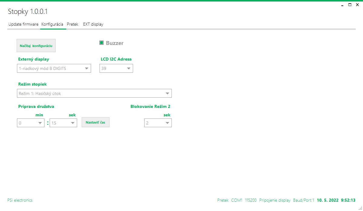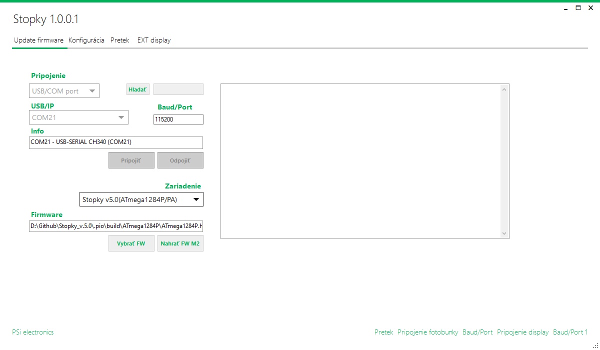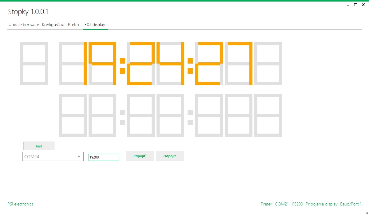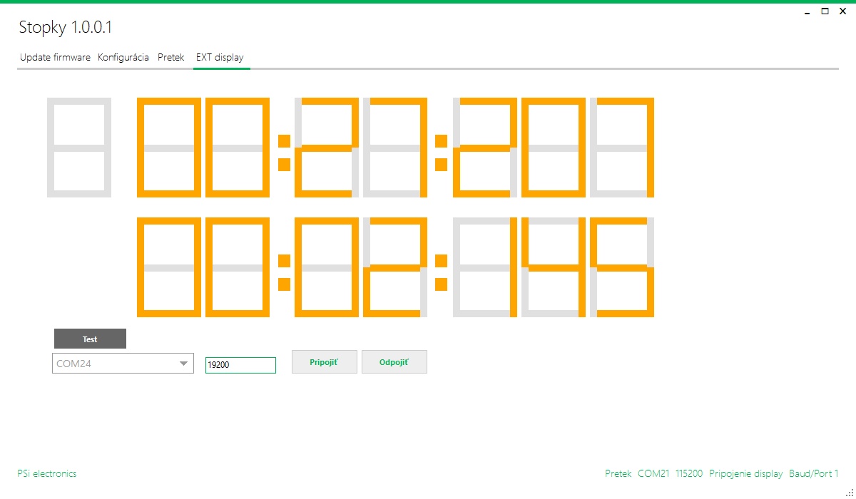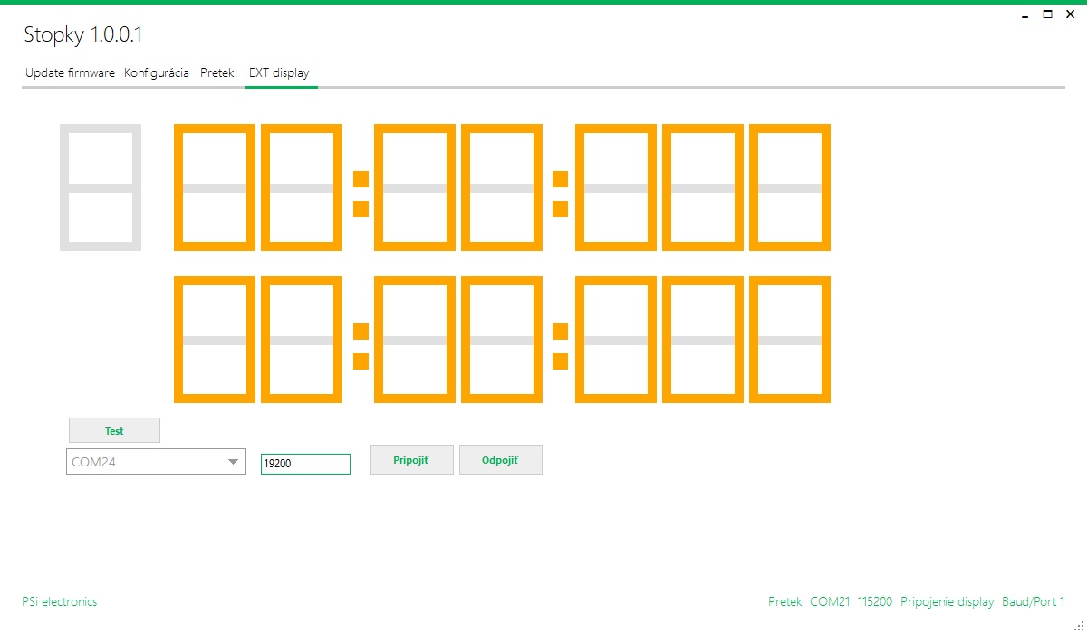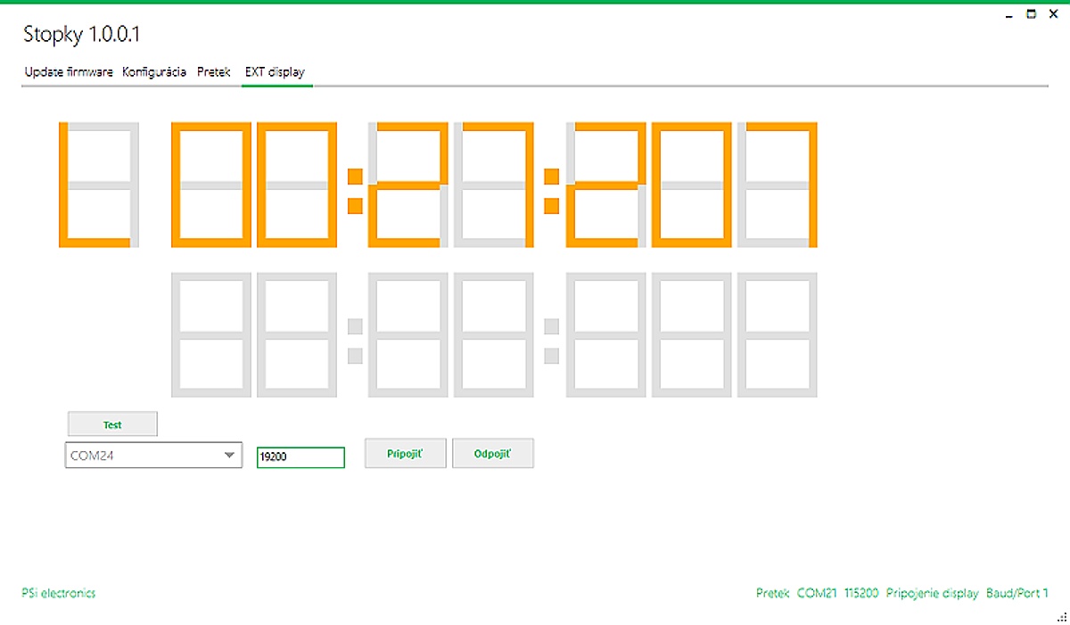 Aktualizácia FW bude prebiehať pohodlne cez rovnakú aplikáciu ako na správu a konfiguráciu stopiek. Aplikácia automaticky pri štarte kontroluje aktualizácie takže sa postará, že užívateľ bude mať vždy najnovšiu dostupnú verziu ;) Aplikácia podporuje automatickú detekciu pripojeného zariadenia, vyhladanie na ktorom pripojenom porte sa nachádza a aký HW (detekcia typu mikroprocesora) pre bezproblémové nahranie nového FW obsahuje. Stopky v.5.0. budú podporovať 1-riadkový 8 znakový externý display kde prvý znak bude zobrazovať dráhu a ostatných 7 znakov s presnosťou na jednotku ms bude zobrazovať čas. Čas po ukončení merania jednej dráhy na stanovený čas na externom displeji zastane spolu s označením dráhy L/P s výsledným časom danej dráhy a potom po určitom čase znova pokračuje a zobrazuje čas druhej dráhy až pokiaľ nebude ukončené meranie aj v druhej dráhe. Taktiež bude podporovaný 2 riadkový displej pre každú dráhu zvlášť. Pre pohodlnejšie ladenie a testovanie zariadenia je v aplikácii aj funkcia Simulátoru externého displeja ktorý automaticky detekuje 1 alebo dvojriadkový režim a zobrazuje výstup priamo zo stopiek miesto zapojeného externého displaya. Taktiež nový FW podporuje RTC takže je možné počas prestávok na externý displej vypísať aktuálny čas ktorý sa samozrejme uchováva aj po vypnutí stopiek.