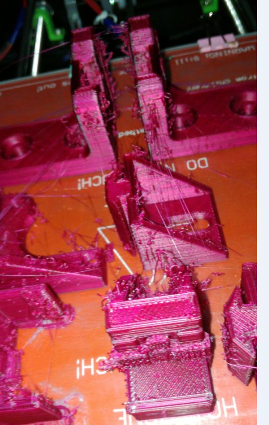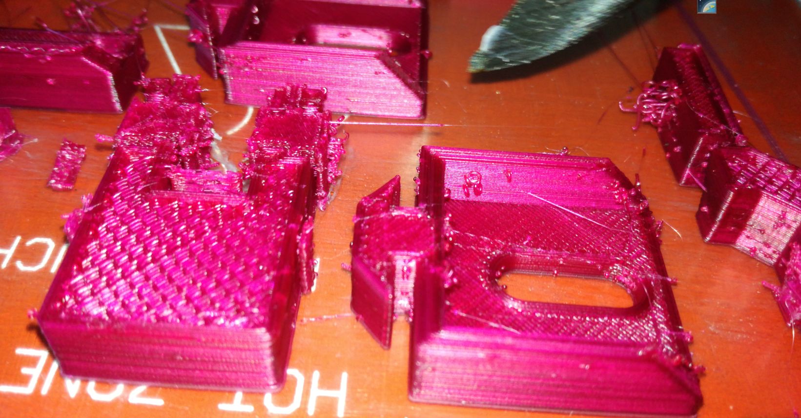 Evidentně teče z trysky filament, když tryska přejíždí z objektu na objekt, čímž tam tahá ty vlákna a pak na dalším objektu asi chvíli ani netiskne než zase nastoupá tlak. Toto bývá způsobeno nízkou hodnotou retractu. U extrudérů přímo u trysky stačí hodnota retractu 1-2mm, pokud používáte bowdenové vedení je možné, že bude třeba tuto hodnotu zvýšit a nebo v tom vedení je nějaký problém.