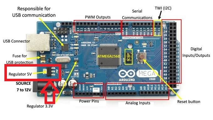 Když jsem zkoušel přes repetier-HOST pohyb tiskové plochy - osy-Y a dal home a sepnul endstop, všiml jsem si že se na arduino desce (AT MEGA 2560) vyzkratoval regulátor 5V - víceméně vyhořel (nad konektorem pro napájecí kabel- viz schéma v příloze).