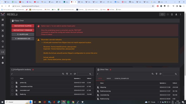 Hlavné úpravy sú: Prechod na 24V napájanie, hotend E3D V6 z prusi, magnetická tlačová plocha, a autoleveling podložky pomocou indukčného snímača inak konštrukcia zostala rovnaká ako u REBELA V33. S vedomím, že ako riadiaci firmware použijem repetier ale kamarát, ktorý má niečo podobné postavené ma presmeroval na firmware klipper, bohužiaľ od neho nemôžem dostať konfiguračný súbor aby som svoju tlačiareň mohol rozchodiť.