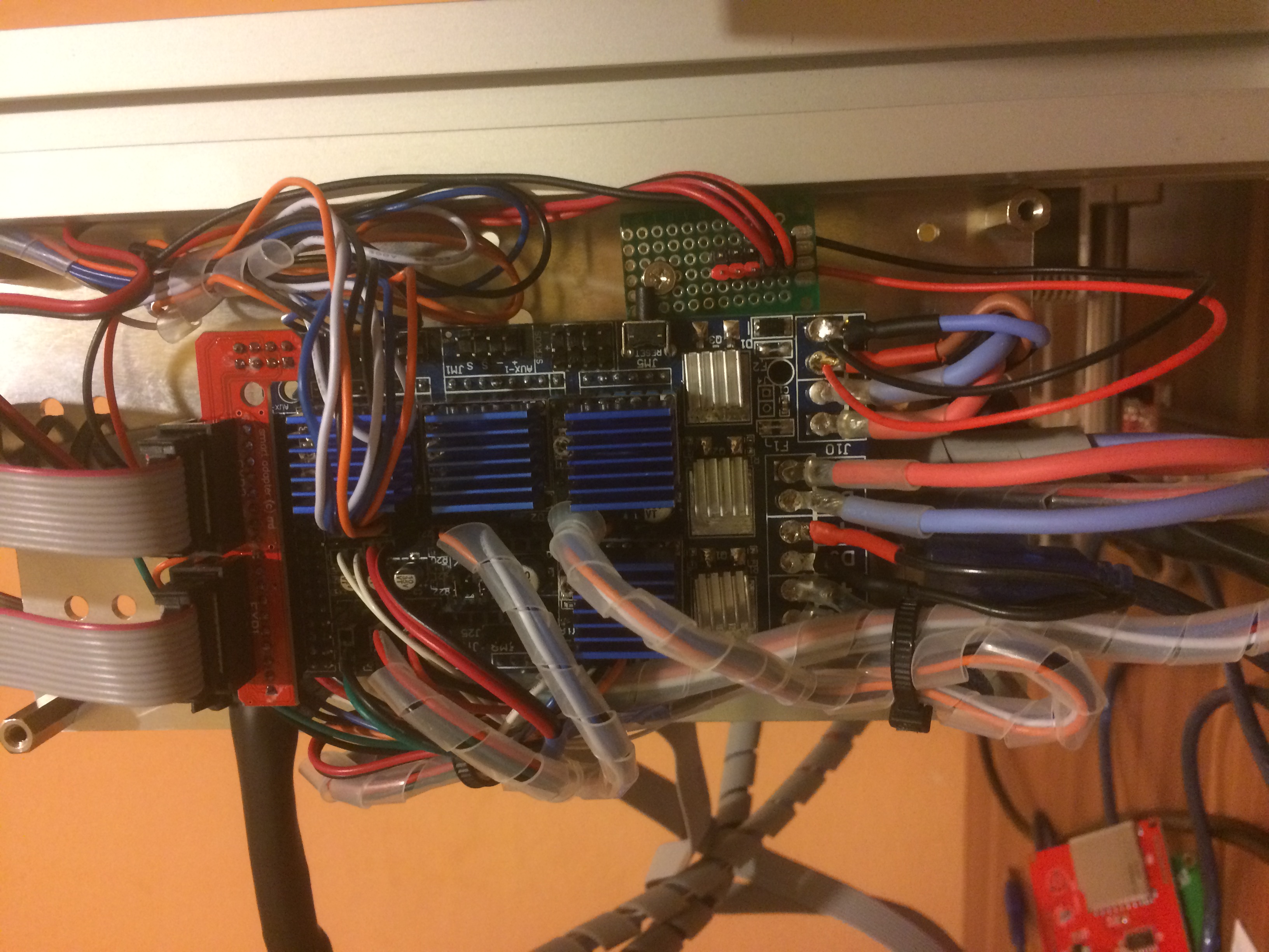 Co se týče elektroniky, trochu jsem váhal a hodně študoval na internetu a nikde jsem se nedočetl jednoznačné odpovědi. Někdo nějakou desku chválil a druhý ji v vzápětí pohanil. Tak jsem šel tou jednodušší cestou (a levnější) a koupil desku Ramps 1.5, kterou jsem si upravil (nebyl to problém, elektronika je můj koníček více jak 30 let). Úprava spočívala v tom, že jsem vyletoval napájecí a výstupní silové konektory, převrtal otvory a zanýtoval pájecí očka. Druhá věc byla samozřejmě výměna MOSFET tranzistorů za IRLR8743PBF v pouzdře DPAK na které jsem nalepil malé chladiče co se používají na chlazení driverů.