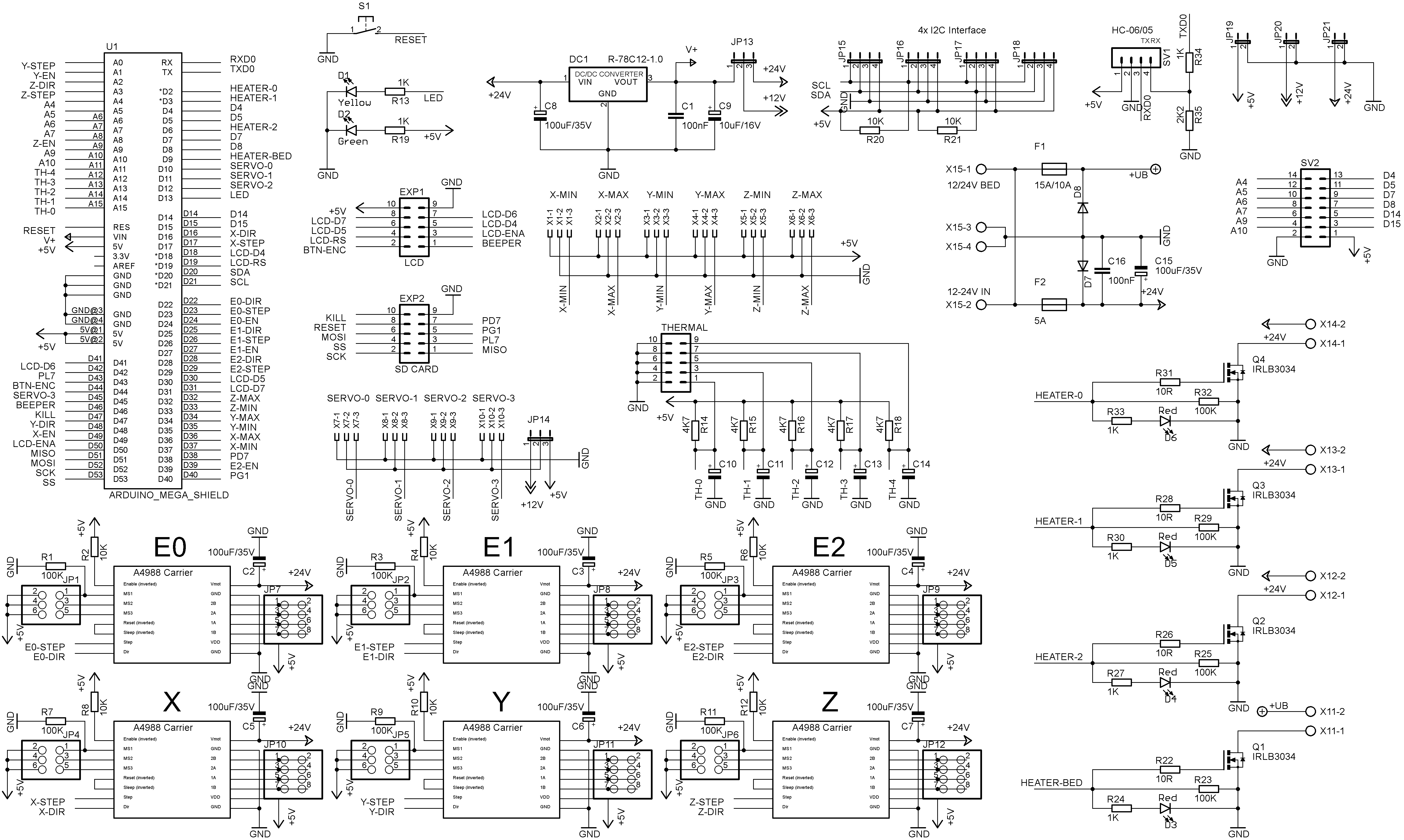 na otázku chyby ve schématu je to jednoduché chybí ti propojení GND na Arduino. Koukal jsem, že ve schématu na webu to máš už opravené :). Jen jsem se chtěl zeptat jak si tam vyvedl nepoužité piny do konektoru, proč si zrovna neudělal výstupy na ventilátory ofuku mat. desky, a třeba hotendu?