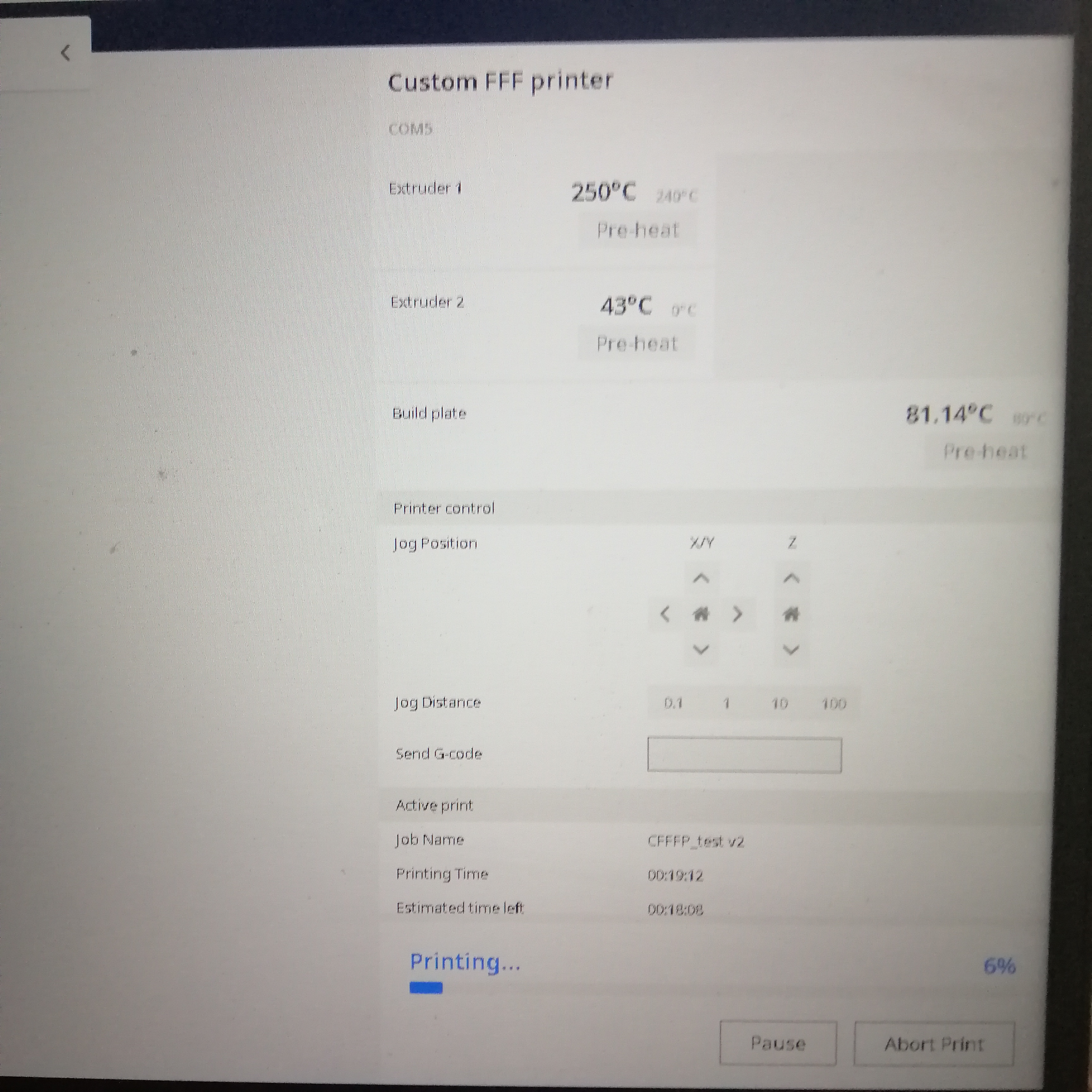 Tento postup vede k hmatatelným výsledkům pouze v jednom, z několika pokusů, což je příčinou naprosté bezmoci. :D Mám dvouhlavou tiskárnu a tisknu zatím pouze jednou hlavou, jednoduchý objekt – kvádr. V programu FusionP360 jsem vytvořil ještě jeden a to kouli, jenže tu se mi ještě vytisknout nepodařilo, ani po úspěšném tisku kvádru. Zkoušel jsem variantu s podporami i bez nich. Když k tisku nedojde, zobrazí se v monitoru tabulka, s teplotami a průběhem tisku, která je přiložena k nahlédnutí. Tisknu ABS s teplotou 140 stupňů, bed byla na 80, nyní na 100 stupňů. Jenže tiskárna se kolikrát ani nerozsvítí.