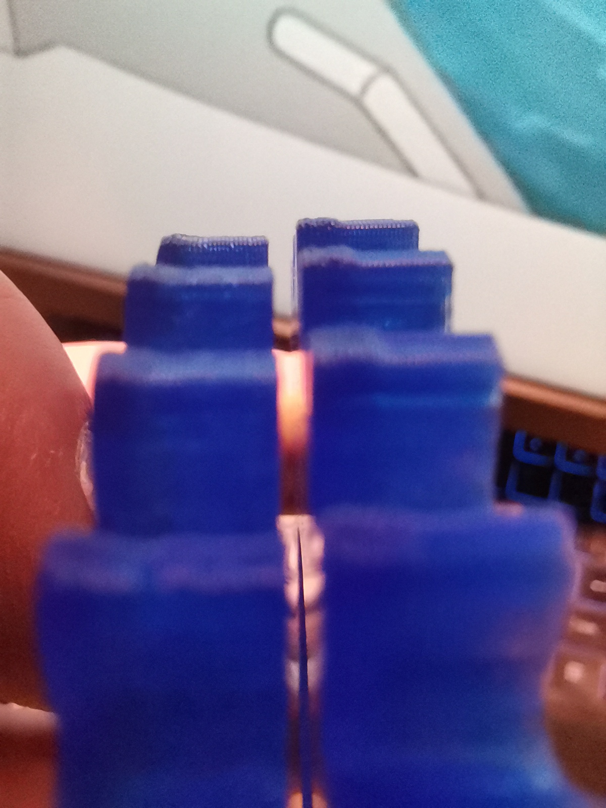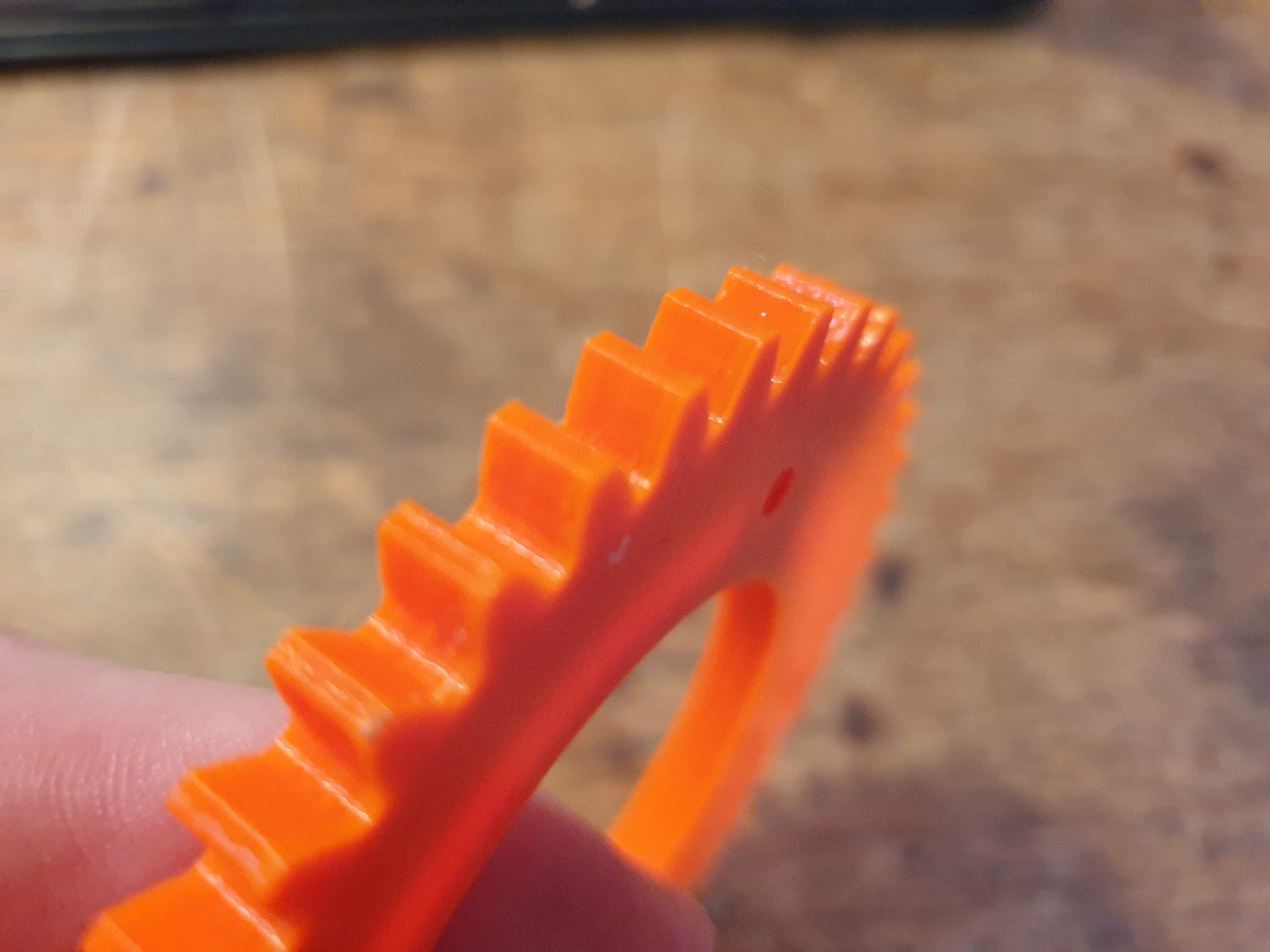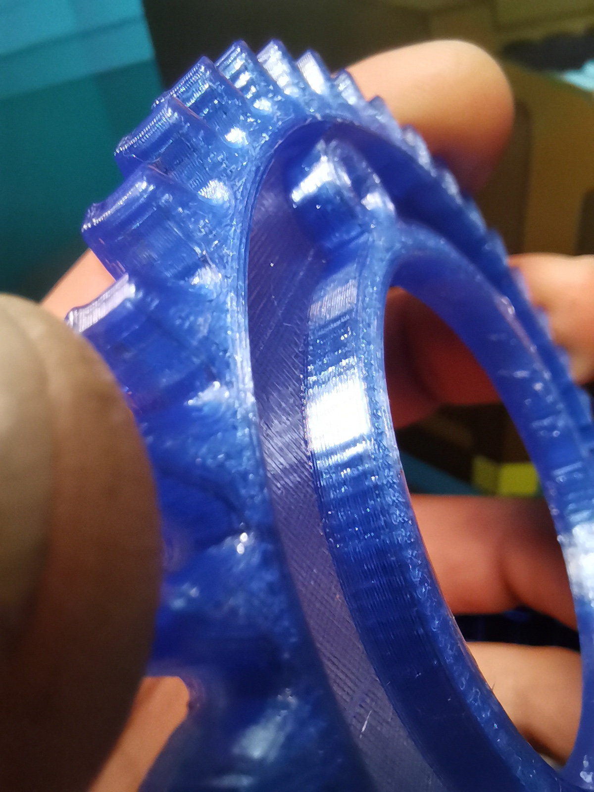 Pak ještě detail. Z boku na těch 75 procent jsem tiskl rychleji tak nevím jestli je to rychlosti nebo menším množstvím materiálu... Ozuby má.asi nejlepší ale stejně první dva mm vrstvi co je kolečko plné., zuby nekopiruji následně vrstvy... A navíc kroužek uvnitř je uppne strasnej...