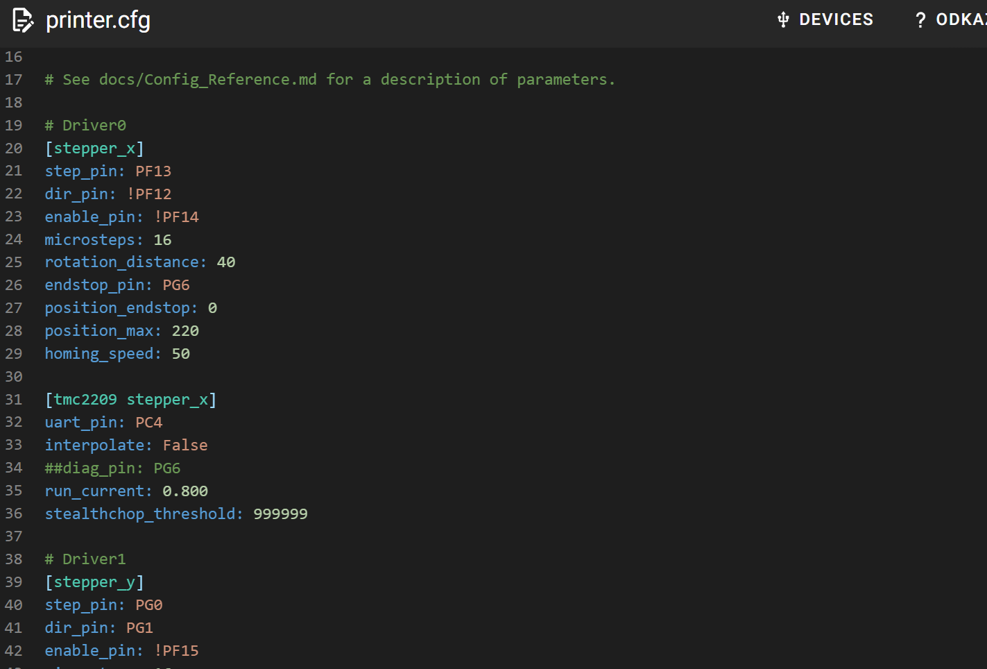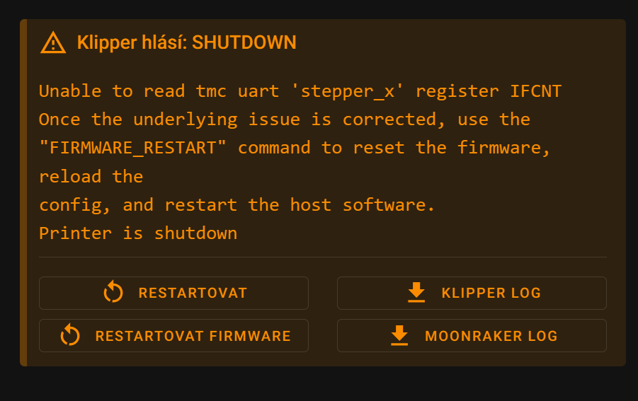 Na druhou stranu u definice jiných desek také není. Osobně s tím nemám až takovou zkušenost, ale stoprocentně je problém v [tmc2209 stepper_x], nebo je driver blbě nakonfigurován a není v režinu UART. Doporučuji projít dokumentaci Klippru a určitě to tam bude rozepsané.