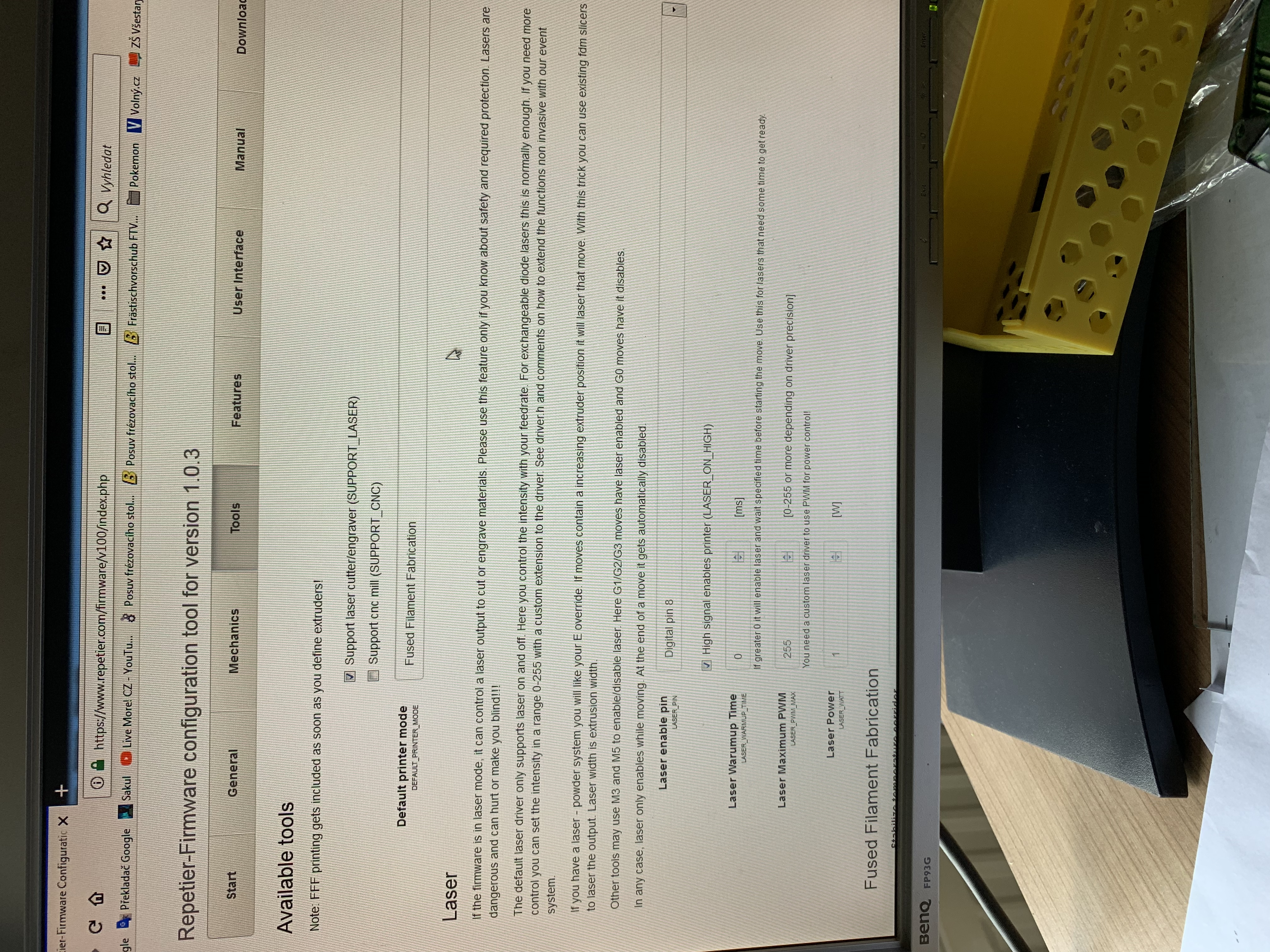 Dále musí být tiskárna přepnuta do režimu laseru. Už nevím přesně jak se to zapíná. Ale ten program pro přípravu G-Code pro laser to nastavuje automaticky. Je v úvodním příspěvku a ukázka je na videu.