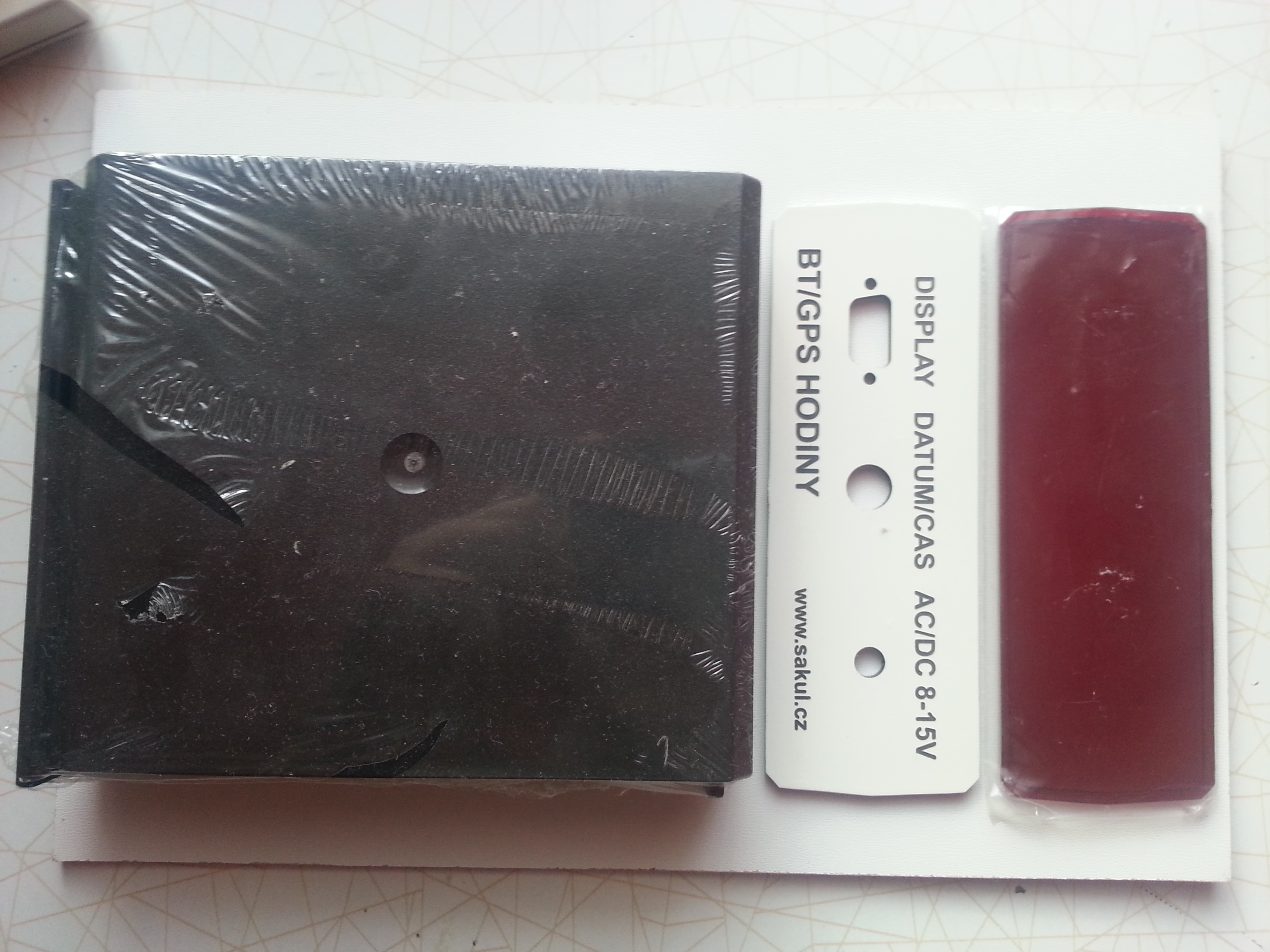 Plastová krabička KM60 (nebo ekvivalent) vhodná pro zabudování hodin. Součástí krabičky je přední kryt z červeného plexi a zadní frézovaný kryt s otvory a popisy.