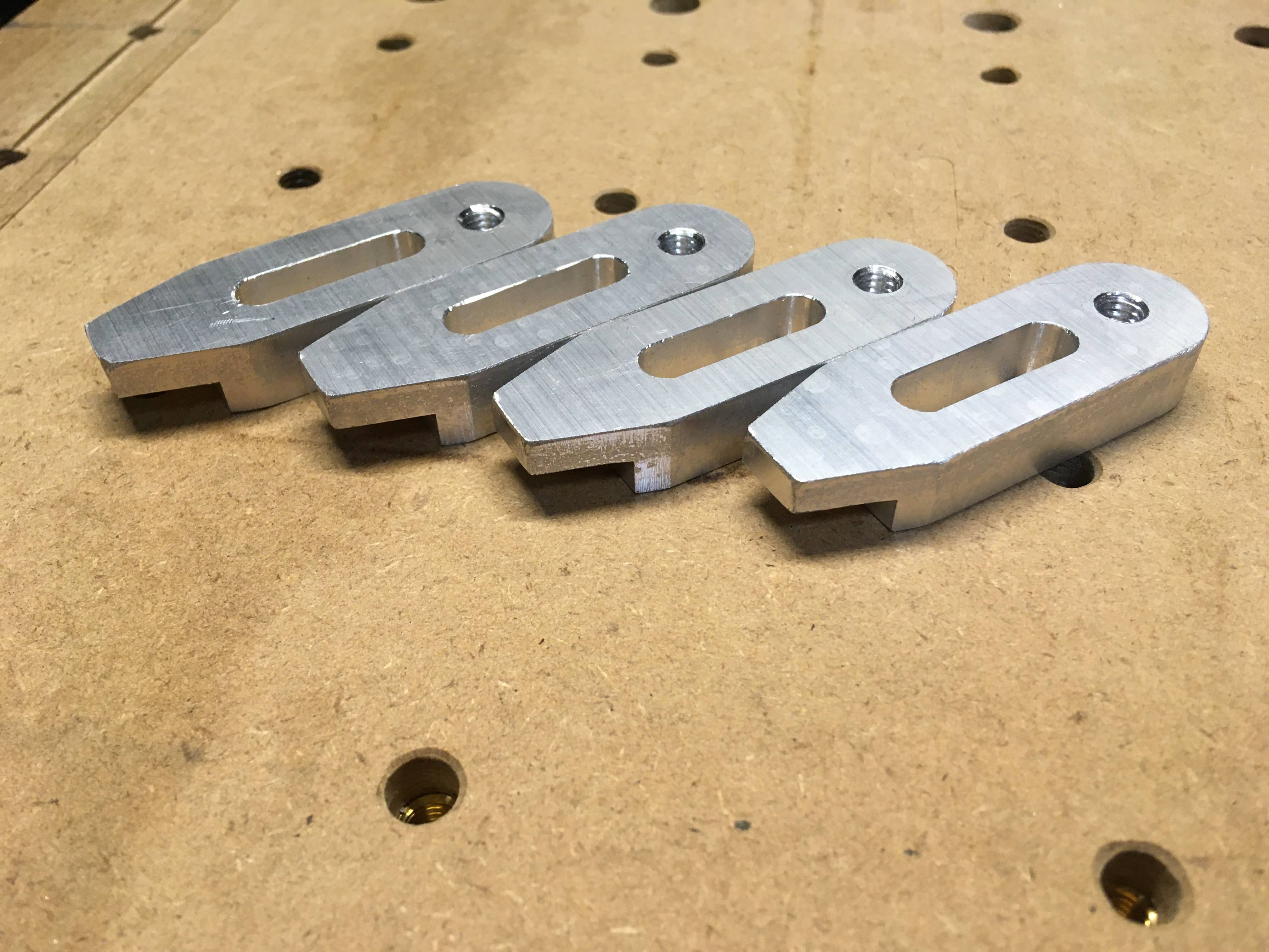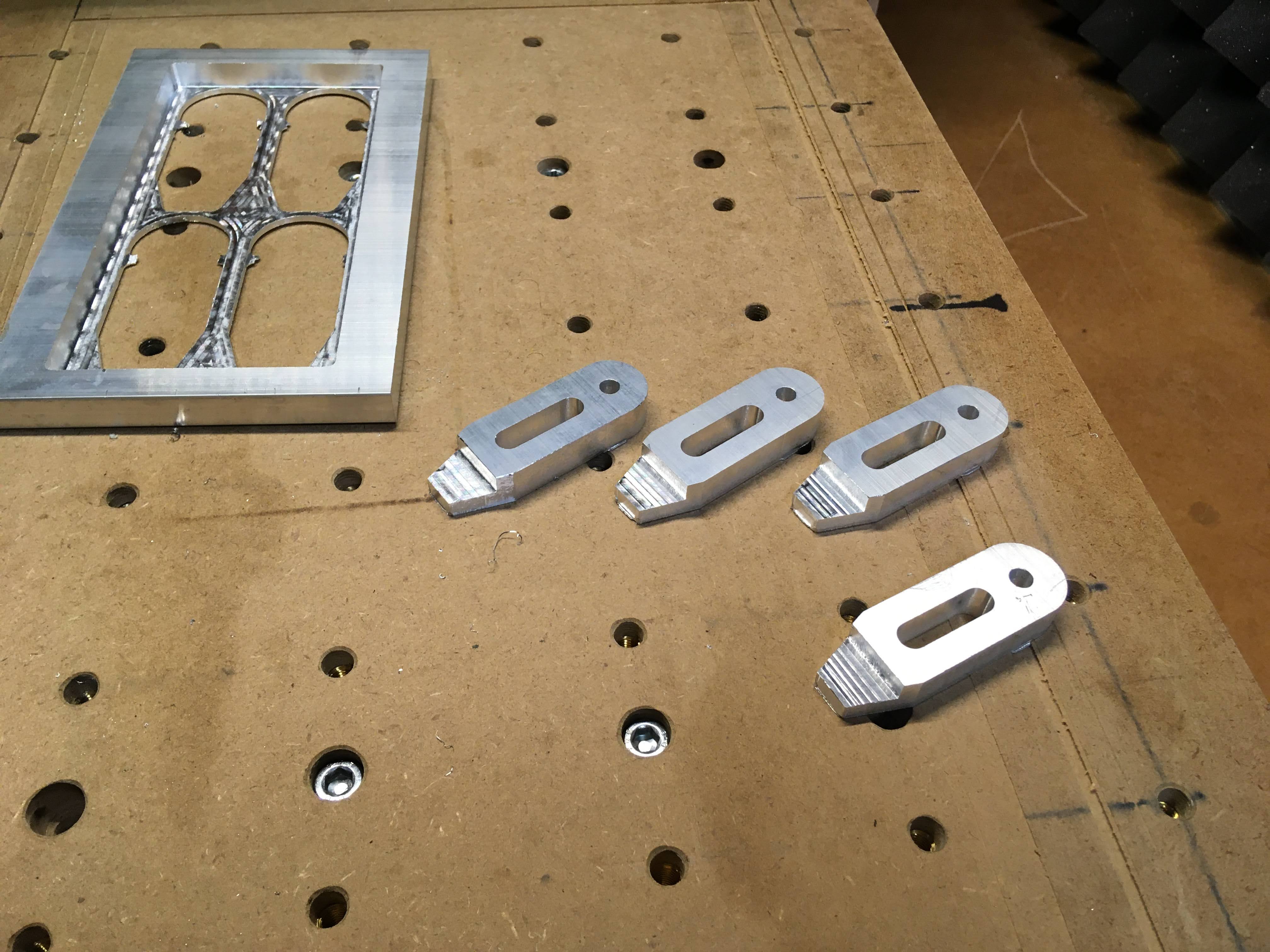 Upínky trvalo obrábět cca 2 hodiny, protože jsem úmyslně ubíral spoustu materiálu - test. Za normálních okolností bych je prostě rovnou nahrubo oříznul jednobřitou frézou a potom objel načisto frézou dvoubřitou do hladka.