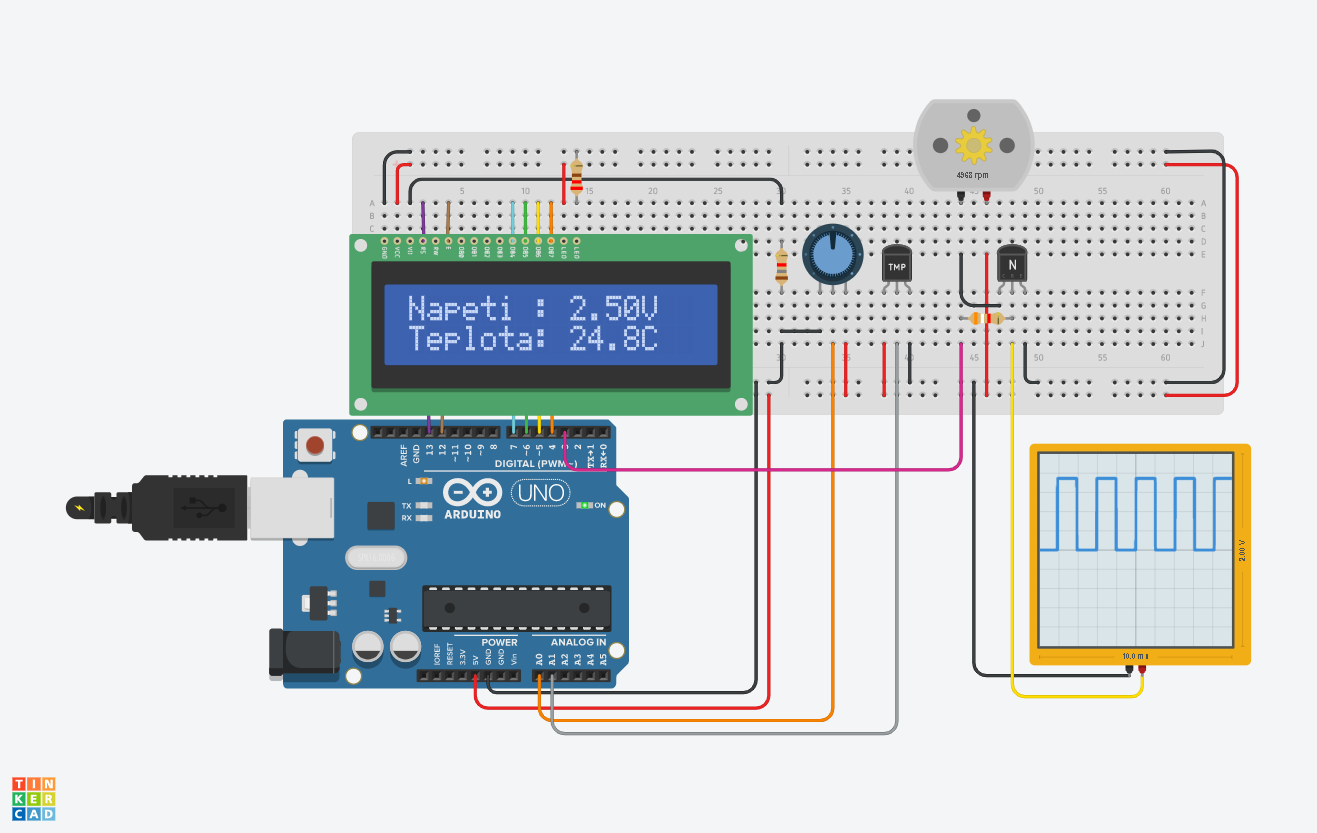 Během mého testování vzniklo jednoduché zapojení s deskou Arduino UNO, LCD displejem 1602, potenciometrem, teplotním čidlem, motorem a osciloskopem. Zařízení na LCD zobrazuje napětí na běžci potenciometru a současně je tato hodnota použita pro řízení otáček SS motorku. Teplotním čidlem je pak možno měřit teplotu. Je dobré, že lze používat i různé měřící přístroje a měřit jimi Vaše zapojení. Já jsem ze srandy použil jednoduchý osciloskop pro zobrazení řídícího signálu PWM pro regulaci otáček motoru.