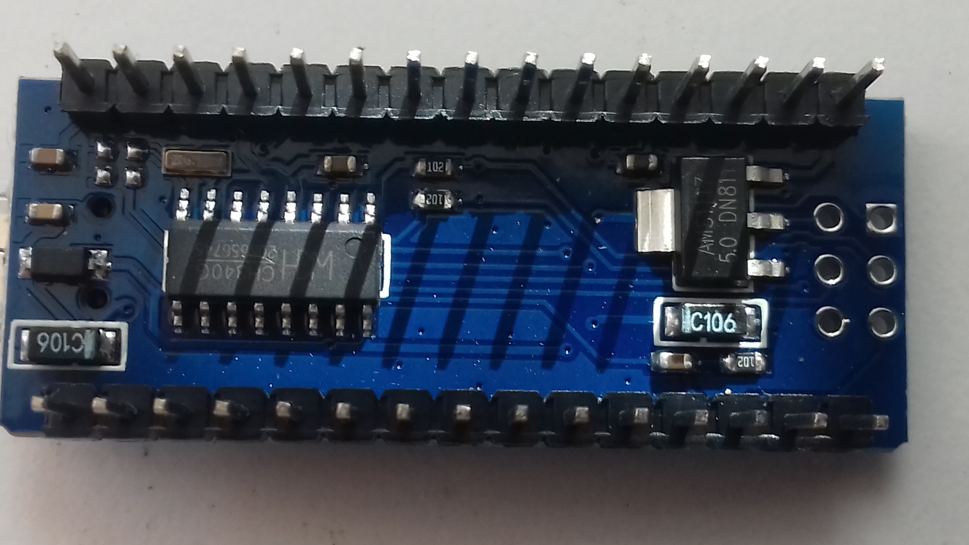 Většina předchozích fotek je procesorové desky Arduino NANO. Tato deska obsahuje procesor ATMEGA328P-AU a USB/TTL převodník CH340. Tato deska obsahuje firmware, který se stará o řízení celého stroje. Aby to nebylo tak jednoduché obsahuje ty firmwary v podstatě 2. Jedním je bootloader a pak již firmware samotný. Bootloader je takoví malý program ve speciální části paměti procesoru, který se vykoná vždy po jeho resetu. Ten umožňuje nahrání firmware bez použití programátoru čistě jen za pomoci USB a samozřejmě nějakého uploaderu (programu, který dokáže do procesoru nahrát firmware v HEX formátu. Dál nemá žádný smysl, abych to nějak dále rozebíral.