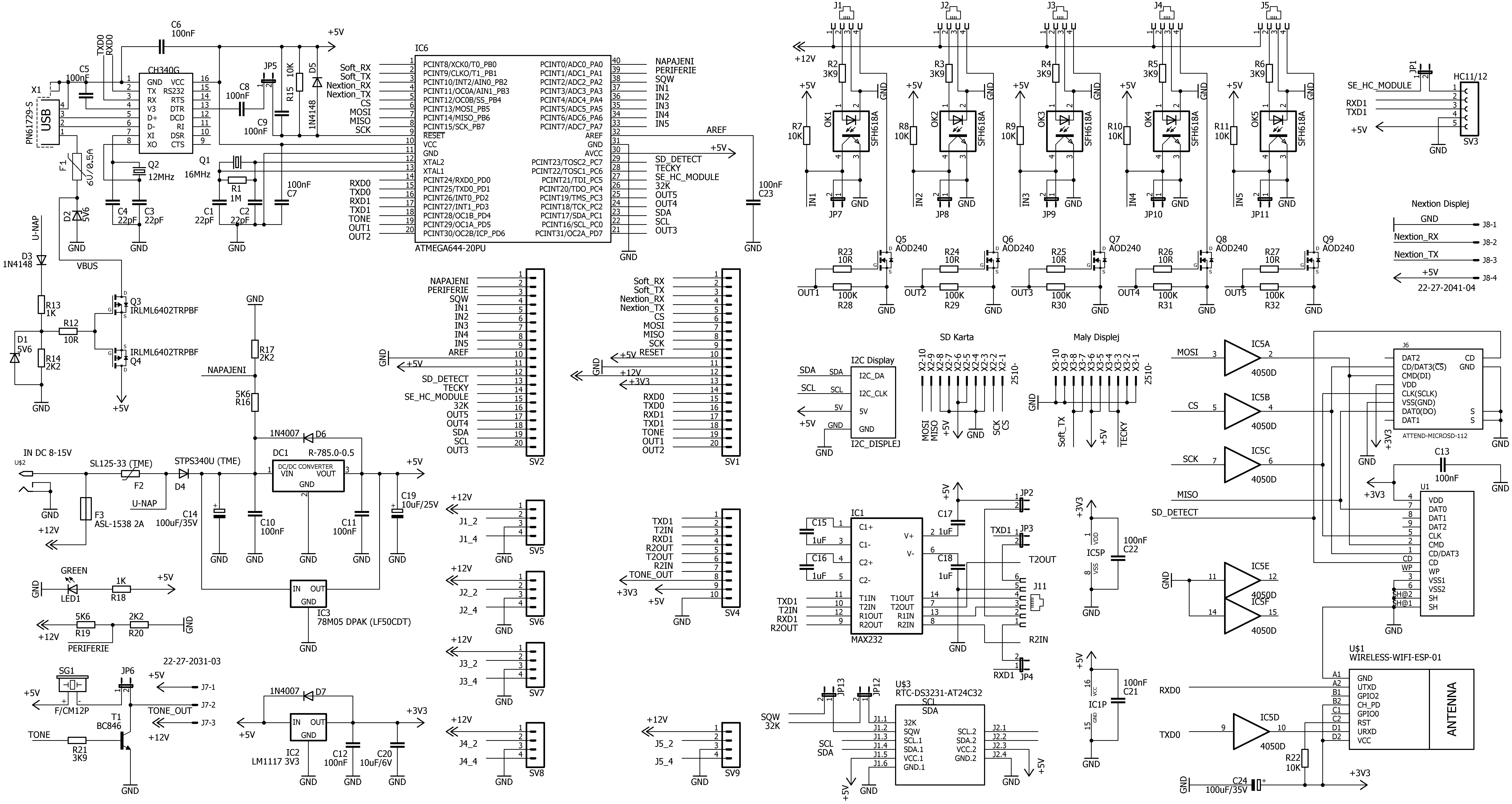 Opět zdravím všechny příznivce různých sportů, kde je potřeba měřit čas nebo zobrazovat nějaké výsledky. V tuto chvíli začíná vývoj nové verze stopek. Tato nová verze bude vycházet z aktuální verze Stopky v4.1 (EA). Původně jsem chtěl vždy jen aktualizovat stávající verzi 4.x, ale ukázalo se, že použitý mikropočítač již nestačí na všechny zamýšlené funkce a tak jeho použití v následujících verzích by bylo problematické. Plus s tímto mikropočítačem bylo i několik dalších problémů, které byly špatně řešitelné. Z toho důvodu bude v nové verzi stopek použit jiný mikropočítač a to konkrétně ATMEGA644. Tento mikropočítač disponuje dostatečným množstvím výstupních portů včetně HW periferií jako jsou například 2 porty UART. Taktéž obsahuje více interní paměti Flash a RAM. Důležitou roli při výběru hrála samozřejmě i cena, která je srovnatelná s mikroprocesorem z verze 4.x, ale navíc je možno tento mikropočítač pořídit i v pouzdru THT (DIP40), což může konstrukci přiblížit i méně zkušeným konstruktérům. Pojďme se tedy podívat co si představuji, že bude nová verze obsahovat: